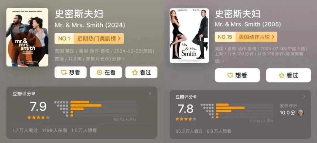 主创团队在原作的基础上,拓展故事深度,从电影体量扩充为电视剧,在原有的故事情节上,挖掘婚姻本质和生活症结,契合了当下观众情绪。翻拍后的《史密斯夫妇》,烂番茄指数 90%,国内豆瓣评分也已经超过了原作。