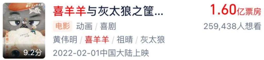 哪怕是观影人次更低的 2022 年,《喜羊羊与灰太狼》都能收获 1.6 亿。