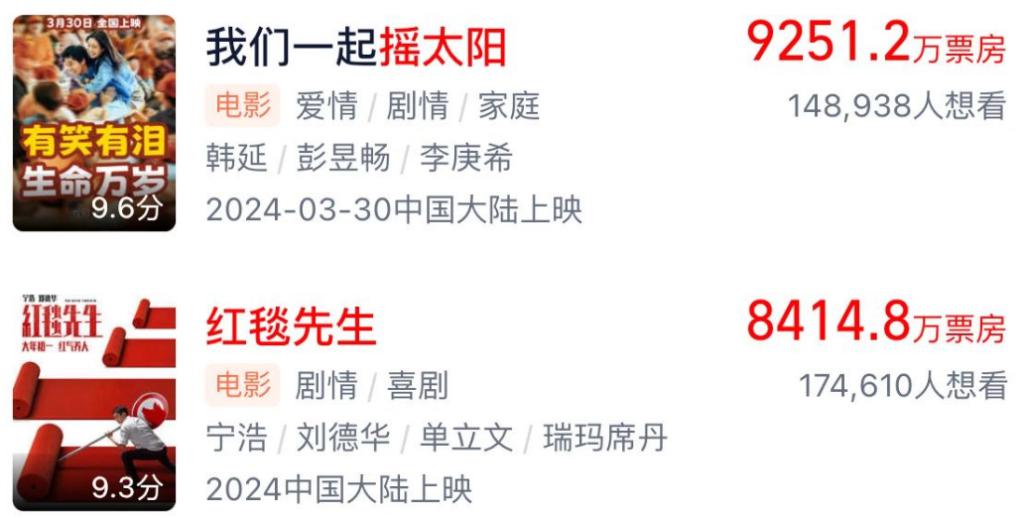 何况,《红毯先生》豆瓣 6.8,宁浩、刘德华对 30 岁以上群体来说,仍有强大的号召力;《我们一起摇太阳》豆瓣 7.9,虽说没有顶流,但题材也是瞄准了年轻人。