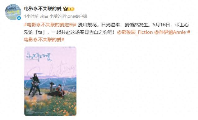4月15日,电影《永不失联的爱》官方微博发文:#电影永不失联的爱定档# 漫山繁花,日光温柔,爱悄然发生。5月16日,带上心爱的「ta」,一起共赴这场春日告白之约吧!