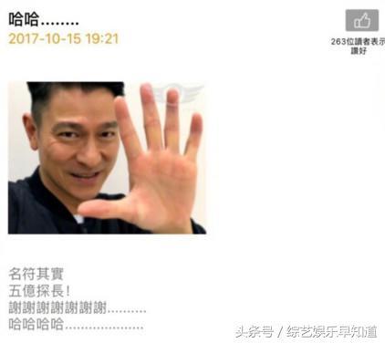 近日,由王晶导演拍摄的电影《追龙》在10月15日晚上票房正式破5亿,主演刘德华开心的在官网宣布“名副其实,五亿探长,谢谢,哈哈”并配上自己伸出五只手指头寓意五个亿的照片当做福利给广大影迷。