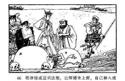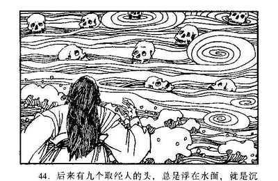“菩萨,我在此间吃人无数,向来有几次取经人来,都被我吃了。凡吃的人头,抛落流沙,竟沉水底(这个水,鹅毛也不能浮),惟有九个取经人的骷髅,浮在水面,再不能沉。我以为异物,将索儿穿在一处,闲时拿来顽耍,这去,但恐取经人不得到此,却不是反误了我的前程也?”