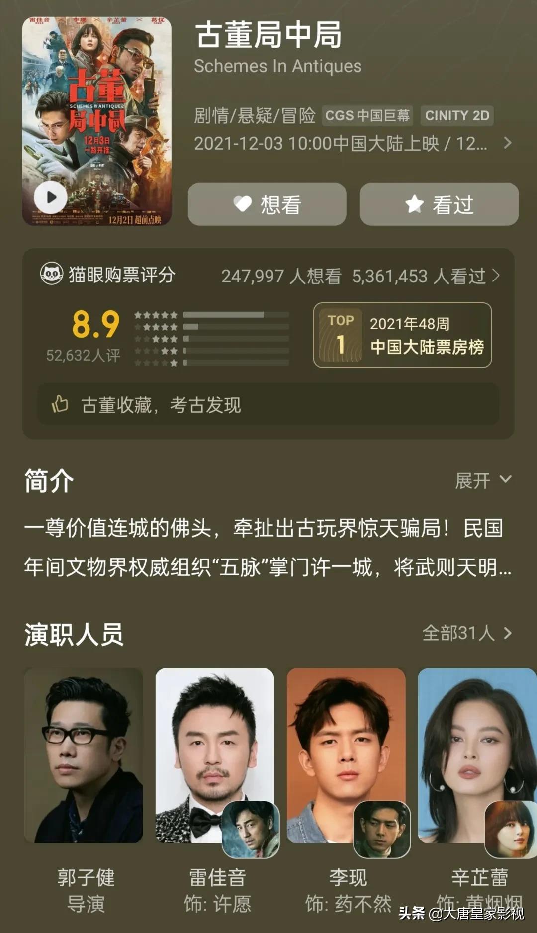 剧情节奏很紧凑,层层推进,局中局,计中计,全程不敢上厕所葛大爷自带幽默细胞,一出场喜剧效果拉满。雷佳音演技很好,醉酒的状态一绝!李现的药不然一登场,整个给我帅爆了,迎来了影厅的第一次轰动。最后发现自己的佛头是假的,那个眼神也很绝,有点让人心疼,亦正亦邪狠狠拿捏住了!辛芷蕾飒爽英姿,有点港风侠女的味道!总之全员演技在线,值得一看!葛大爷带着关系比较复杂的一个大家庭,开启了一段生死寻宝之旅,真真假假,真亦是假,假亦是真。