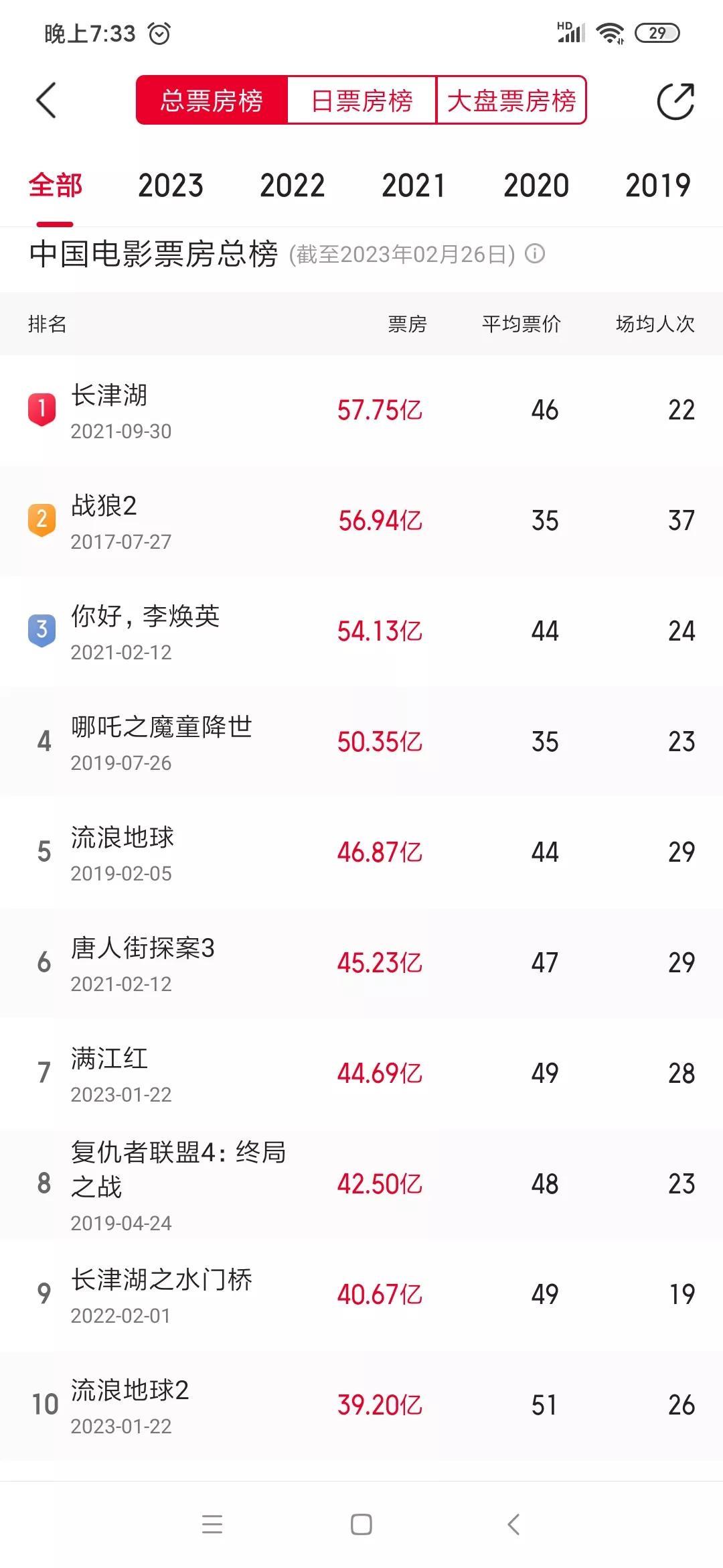 由郭帆导演的《流浪地球2》总票房已突破39亿元,并成功跻身中国影史票房第十名,这也是吴京主演的第五部进入总票房榜前十的影片,其它四部分别是:《长津湖》、《战狼2》、《流浪地球》以及《长津湖之水门桥》。