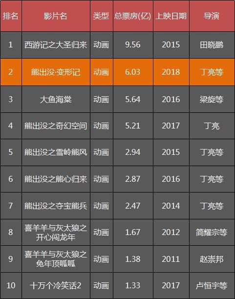 在截止2018年4月1日的最卖座国产动画片十强榜单上,“熊出没”系列霸占了前七席中的五席。“熊出没”系列的主要导演,1968年出生的丁亮,也成为国产动画片总票房第一的导演——五部“熊出没”贺岁动画片已劲收19.52亿。