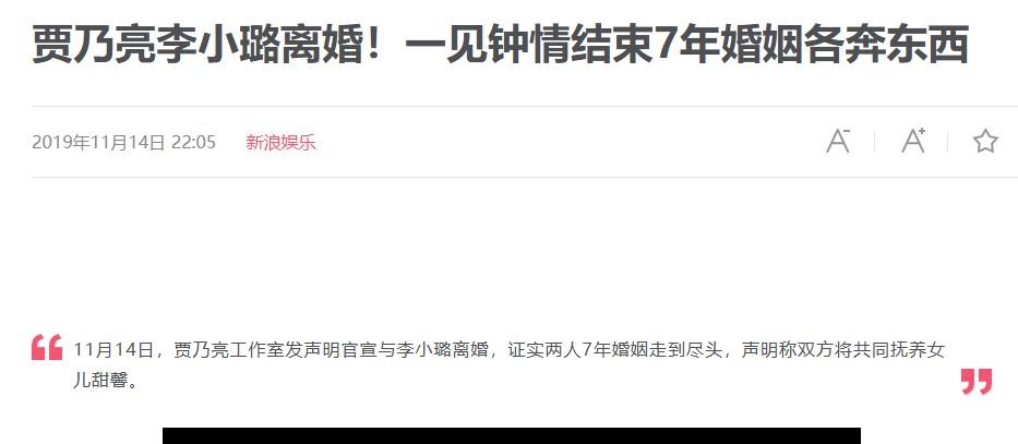 根据新浪娱乐的报道,这个事情刊登于2019年11月14日发布的《贾乃亮李小璐离婚!一见钟情结束7年婚姻各奔东西》