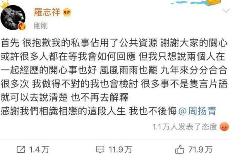 事发之后,为了平息网友的怒火,罗志祥迅速在网上发表了自己的公开声明。直言“对不起,我错了”“我会承担这一切的后果”。