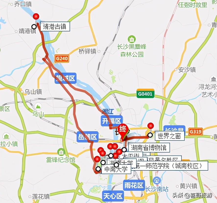 2、长沙十大景点自驾游行程路线:长沙-长沙世界之窗-湖南省博物馆-天心阁-湖南第一师范学院(老校区)-太平街-橘子洲景区-湖南大学-岳麓山风景名胜区-中南大学(本部北校区)-靖港古镇-长沙。