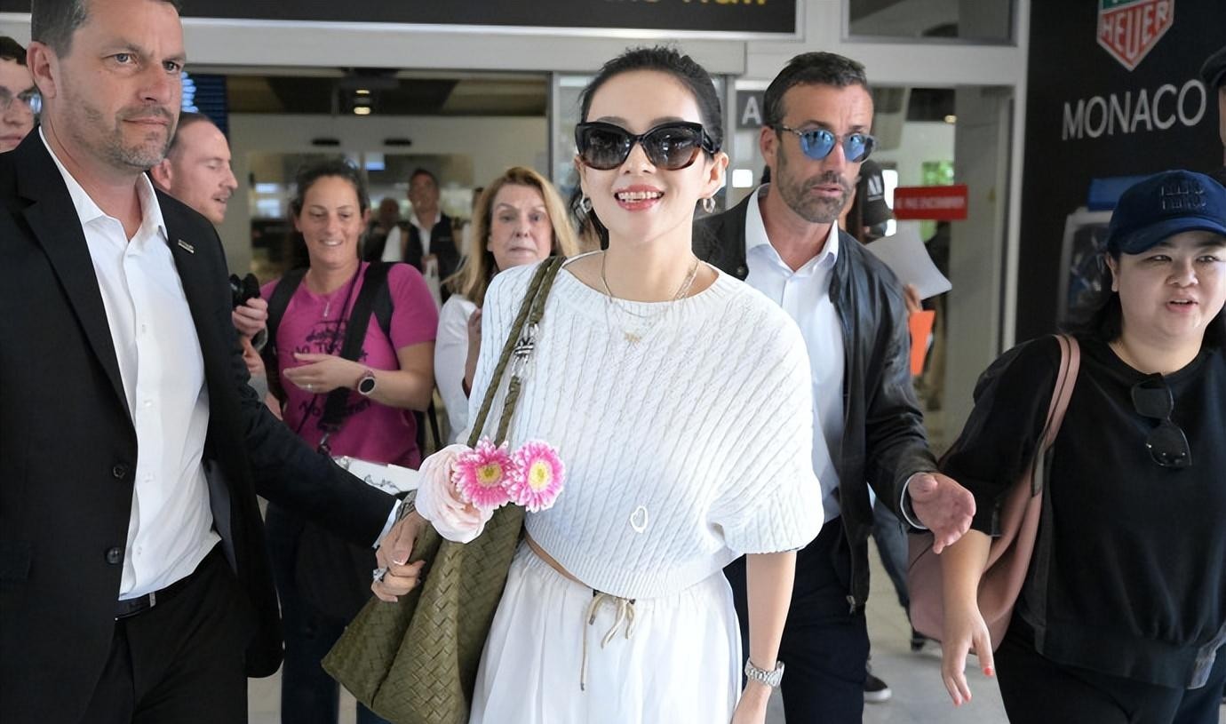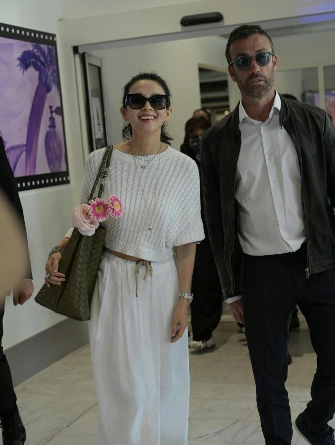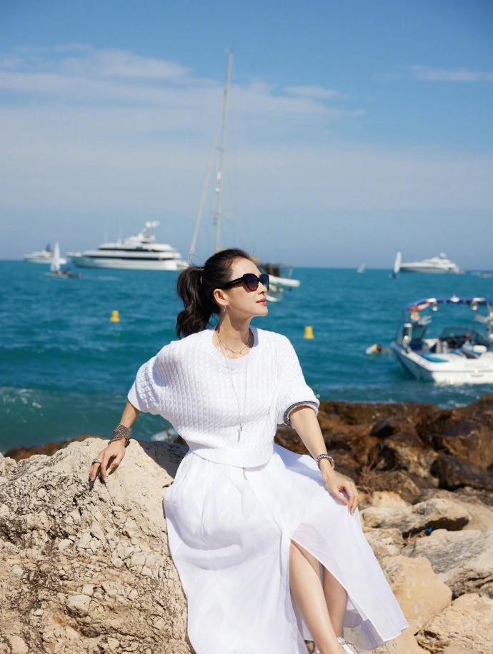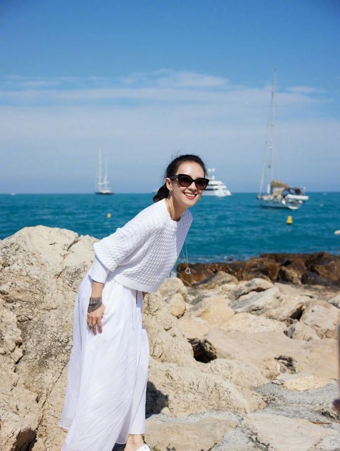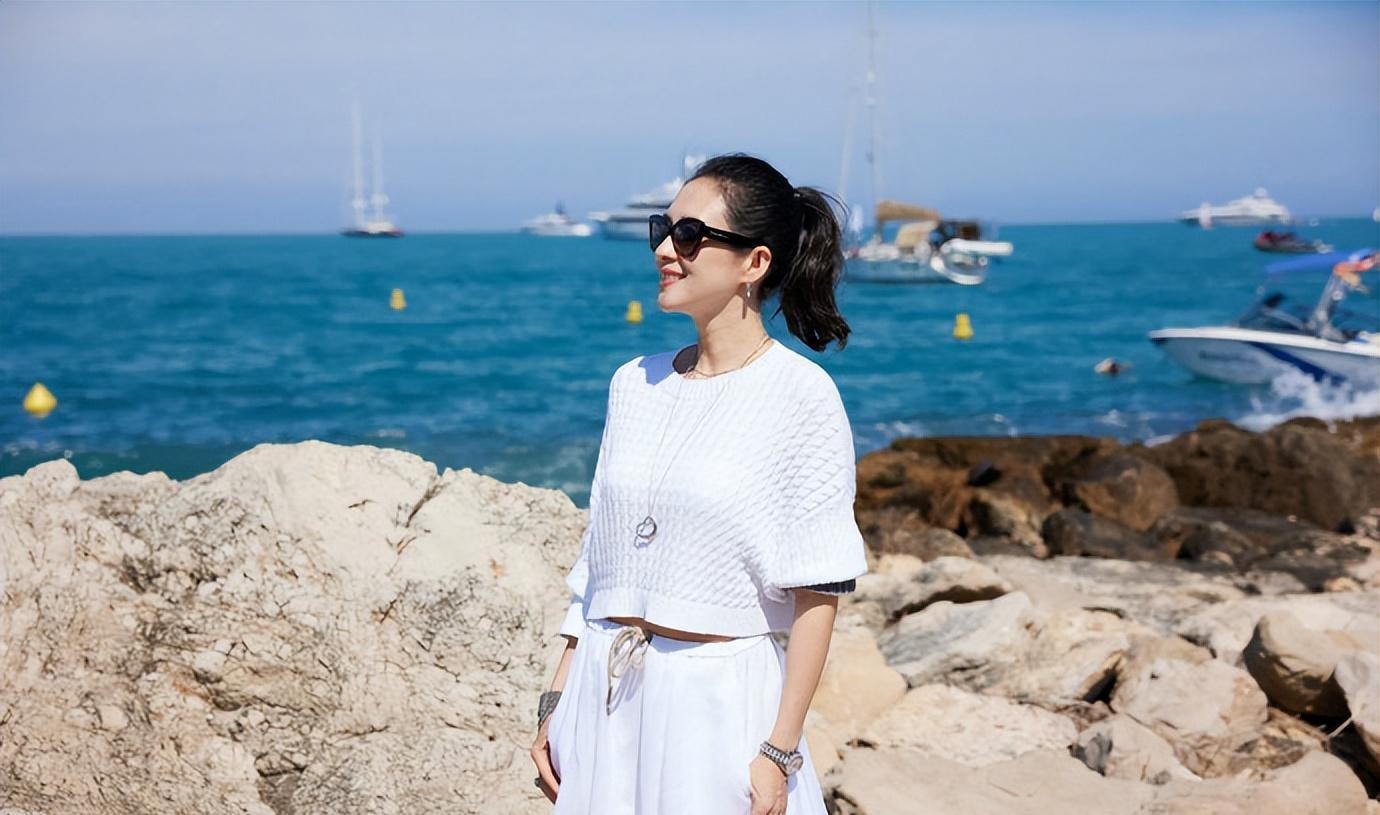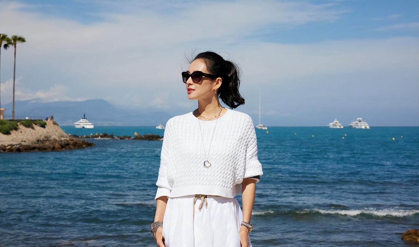 章子怡在戛纳太美了!一身白裙扎着马尾在海边把人美到,心态超好