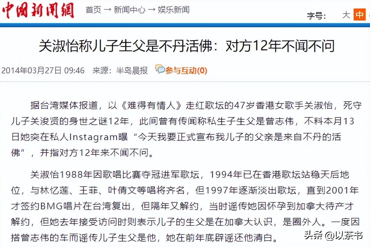 中国新闻网 2014-3-27 关淑怡称儿子生父是不丹活佛:对方12年不闻不问