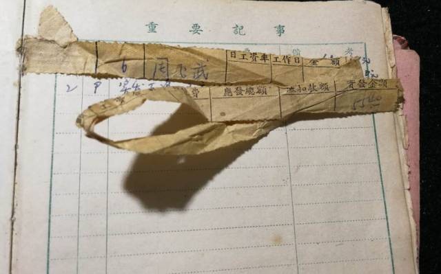在笔记本中发现大伯的工资条,55.4元是当时一笔很不错的月薪。