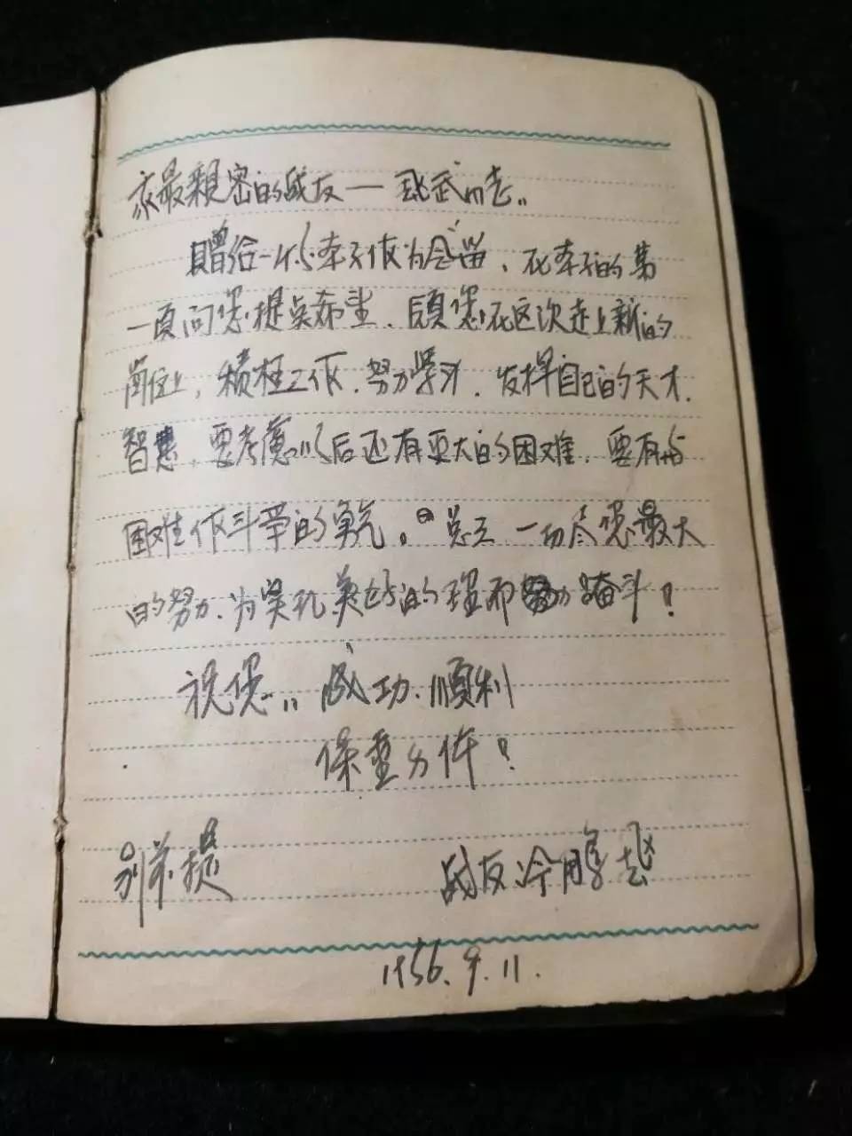 双方情好如手足。1960年飞武大伯退伍归田,冷将军还特地买了一个笔记本,在上面依依不舍留下这样一段话: