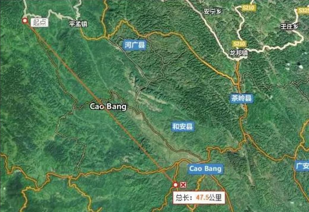广西方向,41军121师进至高平省纳隆,直线距离47.5公里。(41军自己统计实地距离90余公里)