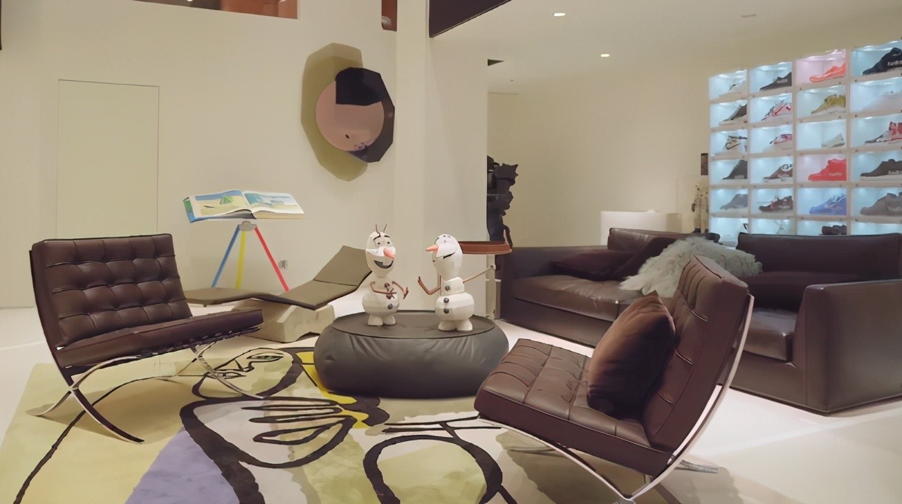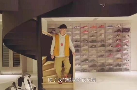 家里的楼梯是旋转的,还有一面墙放的全是限量款球鞋。