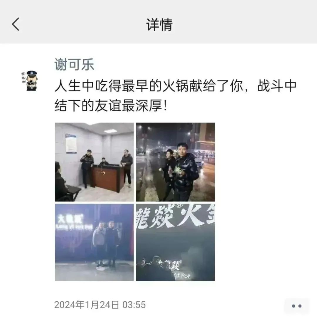 “很久没和天冰搭档审讯了。”简单的一句话,配上两张拍得歪歪扭扭的审讯工作照,这便是刑侦直男谢可乐的朋友圈。就在同一晚,文案中的主人公王天冰也发圈感谢这位“兄弟伙”的支持,齐心协力“拿”下了可喜的战果。