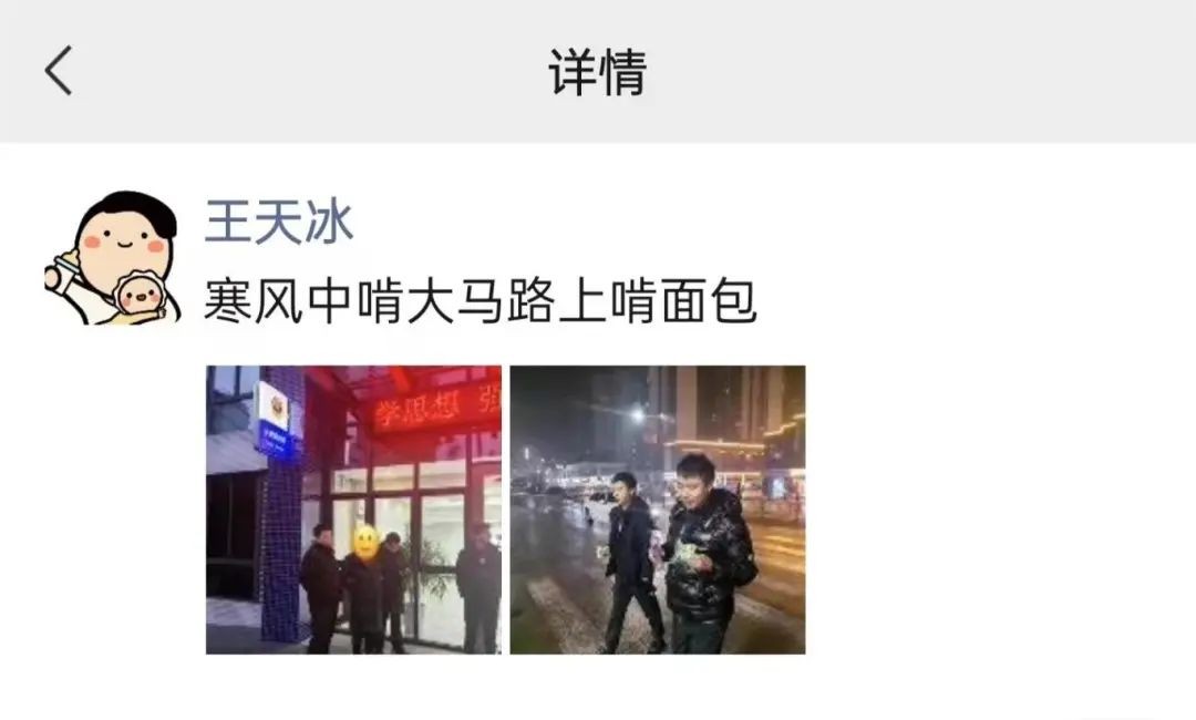 可惜天公不作美,当晚气温骤降,不时还下着雨,天冰一组跑的线索始终没有眉目。“我们就这样淋着雨一直找,饿了就啃个面包充充饥,大家都心有不甘,觉得必须要多挖几个人出来!”说起抓捕行动,王天冰的眼神变得十分坚毅。1月24日凌晨3点过,大家的衣服已经“焦湿”,但也终于追寻到了有力线索,考虑到时机不够成熟,天冰和可乐商量暂且不作行动,先奔赴一场凌晨四点的“火锅局”。深夜的面包,凌晨的火锅,男人的情谊就是这样简单。凌晨3点55分,可乐又又又发圈了,配图依旧直男:审讯工作照+风中啃面包的自己+与天冰的合照。