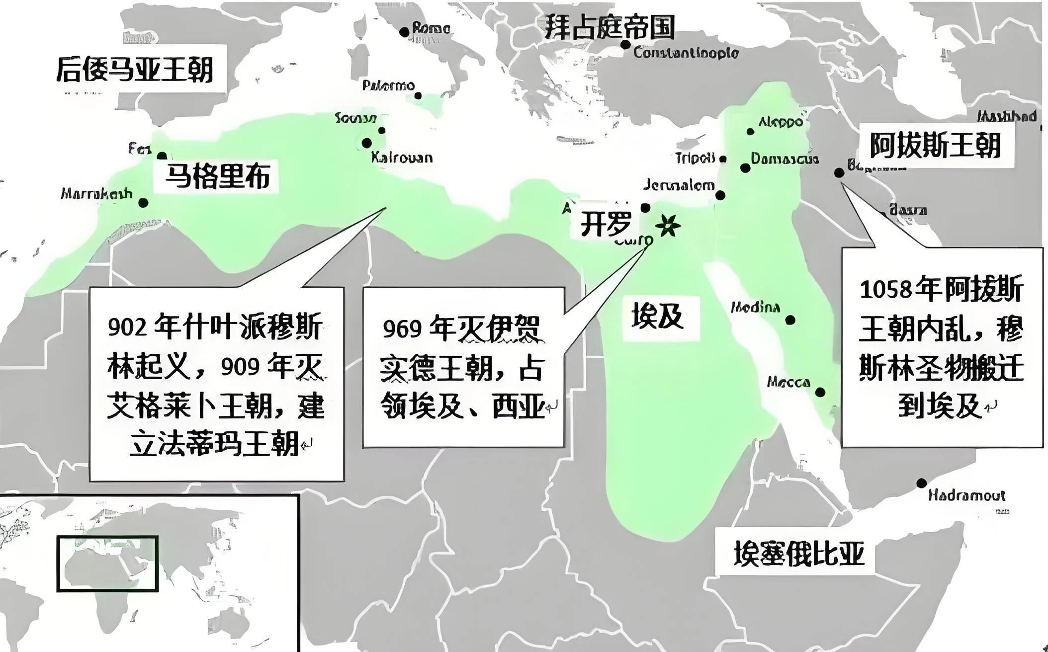 阿巴斯王朝的实权被突厥人控制后,帝国四分五裂。一部分什叶派向东占领埃及,迁都开罗。继任者们占领了很多北非和西亚地区。在法蒂玛王朝的统治时期,埃及经济和农业得到较快发展。由于国家长期稳定,开罗甚至一度成为地中海沿岸贸易最发达的城市。