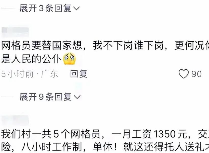 有个自称是网格员的人在评论区倒起了苦水:“咱们村一共五个网格员,每月工资1350元,还得交五险,每天工作8小时,一周单休。