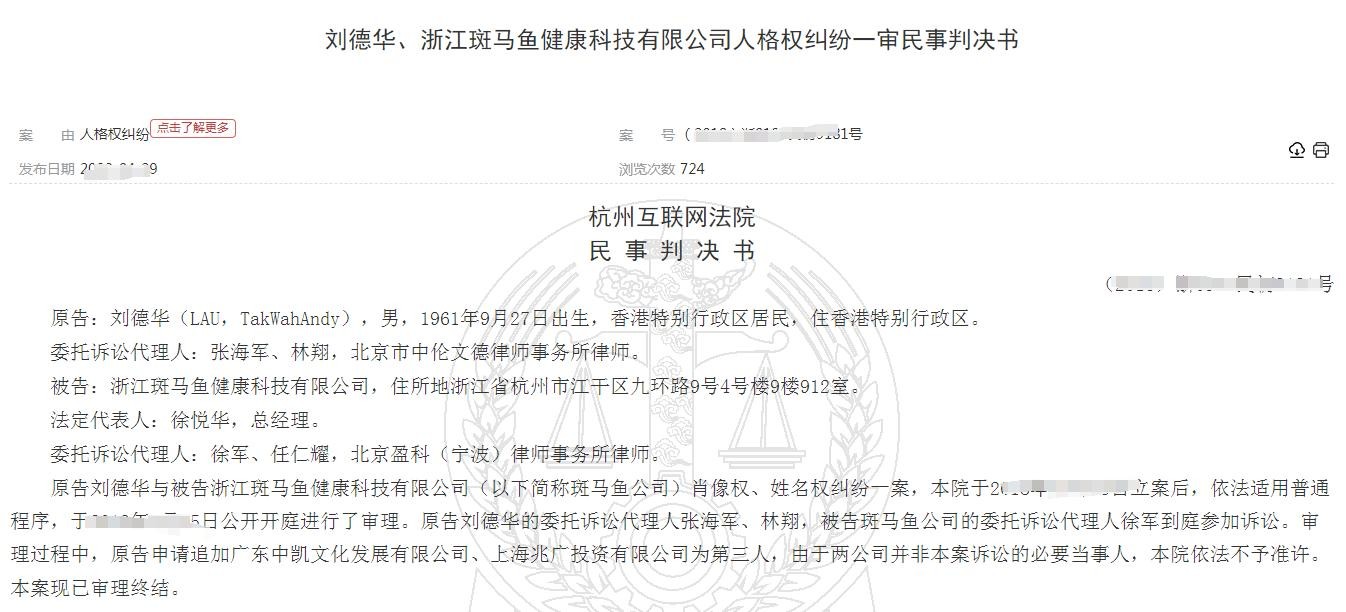 据中国裁判文书网披露,刘德华曾状告浙江斑马鱼健康科技有限公司,索赔人民币200万元,该案在杭州互联网法院开庭审理。