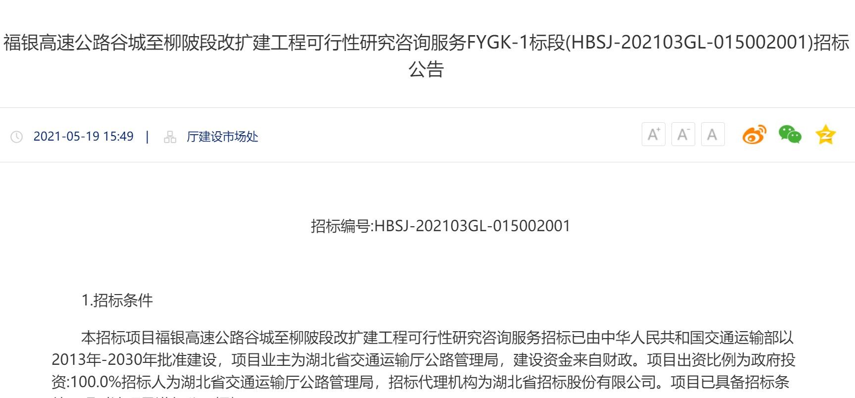 福银高速公路谷城至柳陂段改扩建工程可行性研究咨询服务工作的招标已经启动。主要是编制本项目工程可行性研究报告,以及协助招标人完成报告或文件的报批等工作。