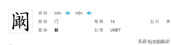 从上图中我们可以看到,“阚”字的汉语拼音是有两个读音的,一个是读作【kàn】,读第四声,音同“看”;另一个是读作【hǎn】,读第三声,音同“喊”。部首是“门”字,总笔画是14。