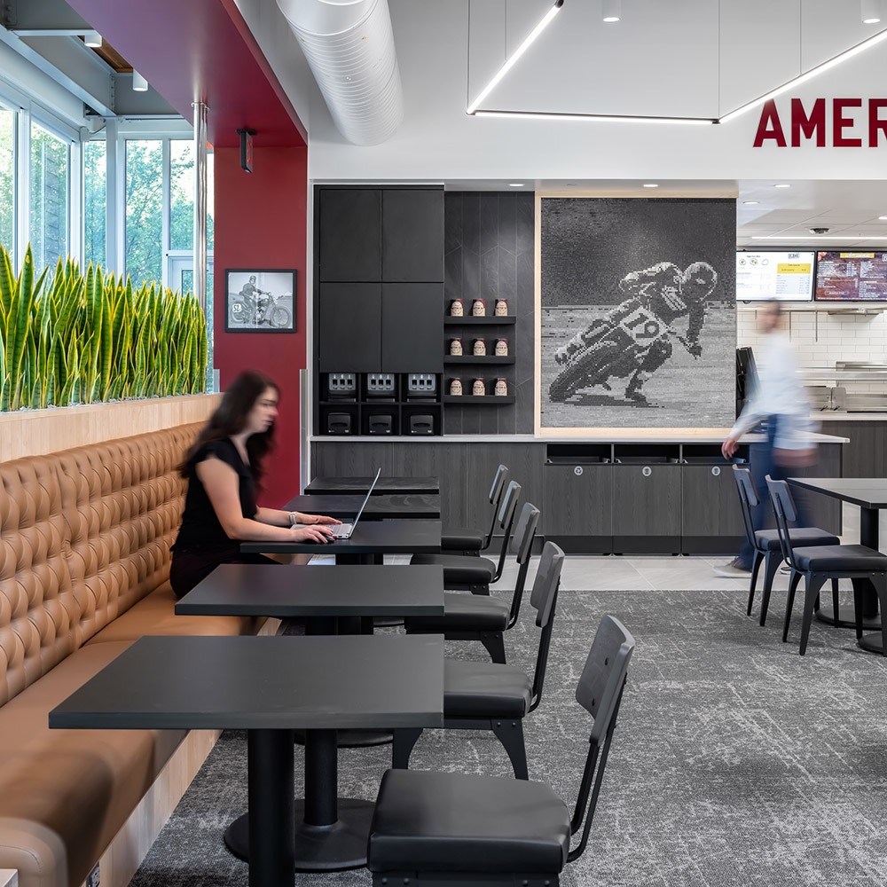 此次总部重塑还优先关注员工健康福祉的设施规划,设计团队重塑了总部的协作区和聚集区。通过将所有展示车辆集中放到展厅空间,设计团队在开敞的办公环境中创建了更多的休闲协作空间,并引入大量创新图形设计,带来更具沉浸感的产品体验。此次更新升级包括员工工作咖啡吧、产品陈列展厅、新的董事会议室、自助餐厅和零售店,以及所有员工工作区。