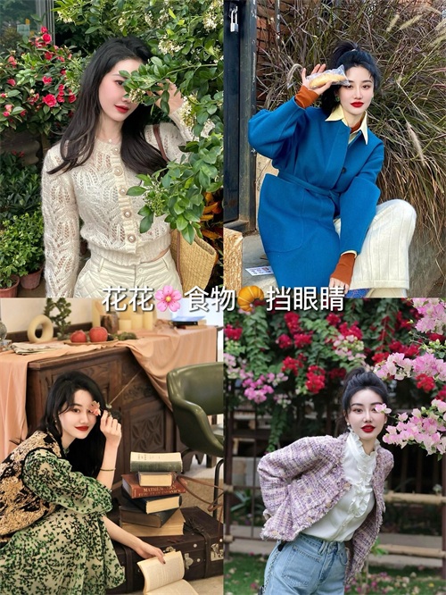 在拍照时利用花花草草或食物遮挡眼睛,能够增加照片的神秘感和趣味性。比如,可以用一支花遮住半边脸,或者用手中的甜点遮挡眼睛,这样的拍照姿势不仅独特,还能突出主体,增强照片的视觉效果。这个姿势非常适合在花园、咖啡馆等场景中拍摄。