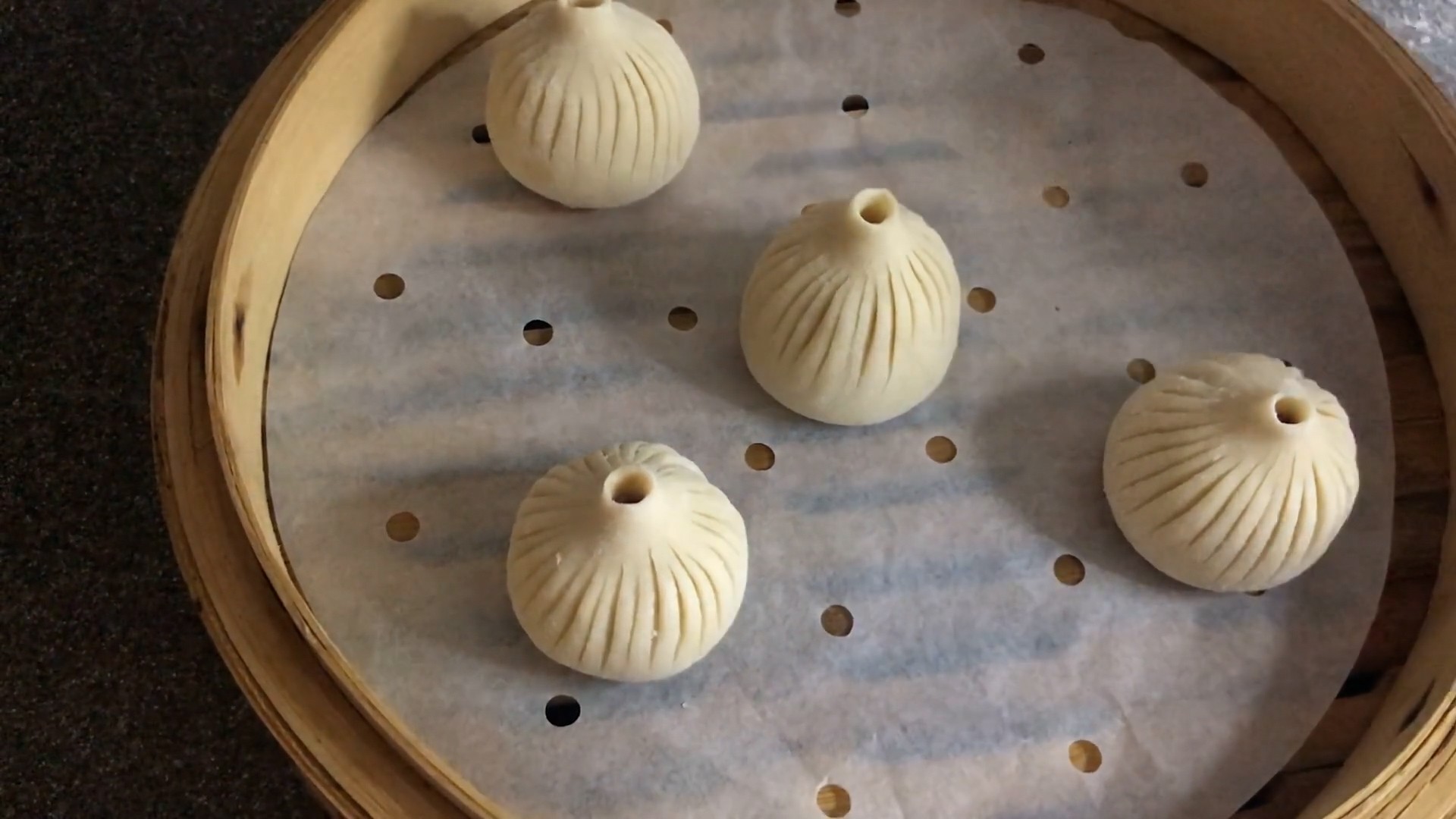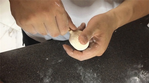 大家注意,用一个筷子插进去,慢慢收口,把包子稍微拉长一点,最后修正一下。