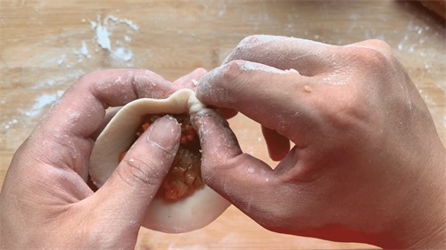 把面团分成大小一样的面积子,刚好面皮(中间厚外面薄)就可以包了,重点来了,大家仔细看手法。一般20-25个褶子。