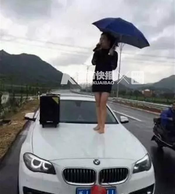 今年6月份,为吸粉,一黑衣女网红,在台州马路边,不顾车来车往,赤脚踩宝马车顶直播唱歌,进了警局。