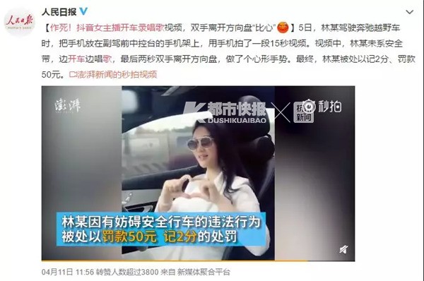 今年4月份,为拍抖音,台州一奔驰女司机边开车边唱歌还双手比心,被罚:记2分、罚款50元。