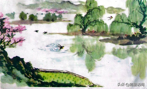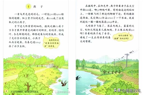 很多80后对于《燕子》的记忆是从这幅插画开始的,作为一篇“看图学文”的配图,这幅画全景展现了明媚的春光,描绘了一幅桃红柳绿、湖光山色,乌黑的燕子低飞戏水的春景图,一眼望去,满眼春意盎然。