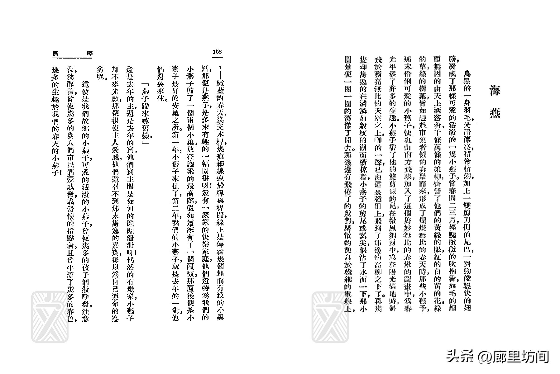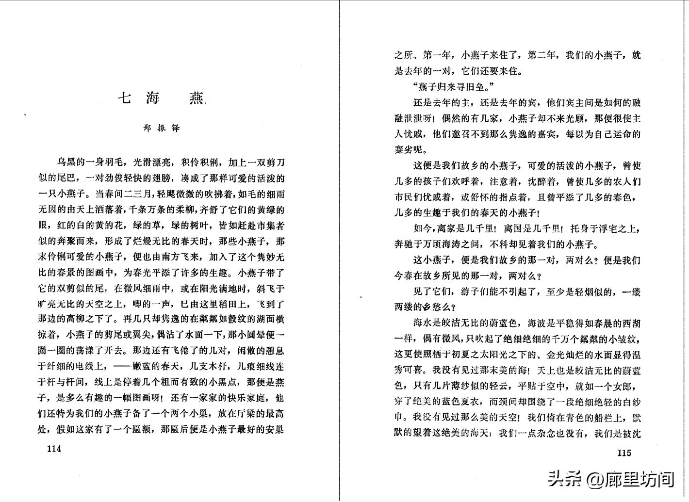 就像我们只见《鸬鹚》却不见吴世宝一样,看《燕子》也想不到它居然是由一群海燕而想起来的。我们从《海燕》的全文来看,郑振铎写春的细雨、春的和风、春的色彩、春的氛围,寥寥几笔刻画出家乡小燕子的可爱模样,都是为了写出那股难以排遣的乡愁,就如《海燕》的结尾:“啊,乡愁呀,如烟似的乡愁啊!”