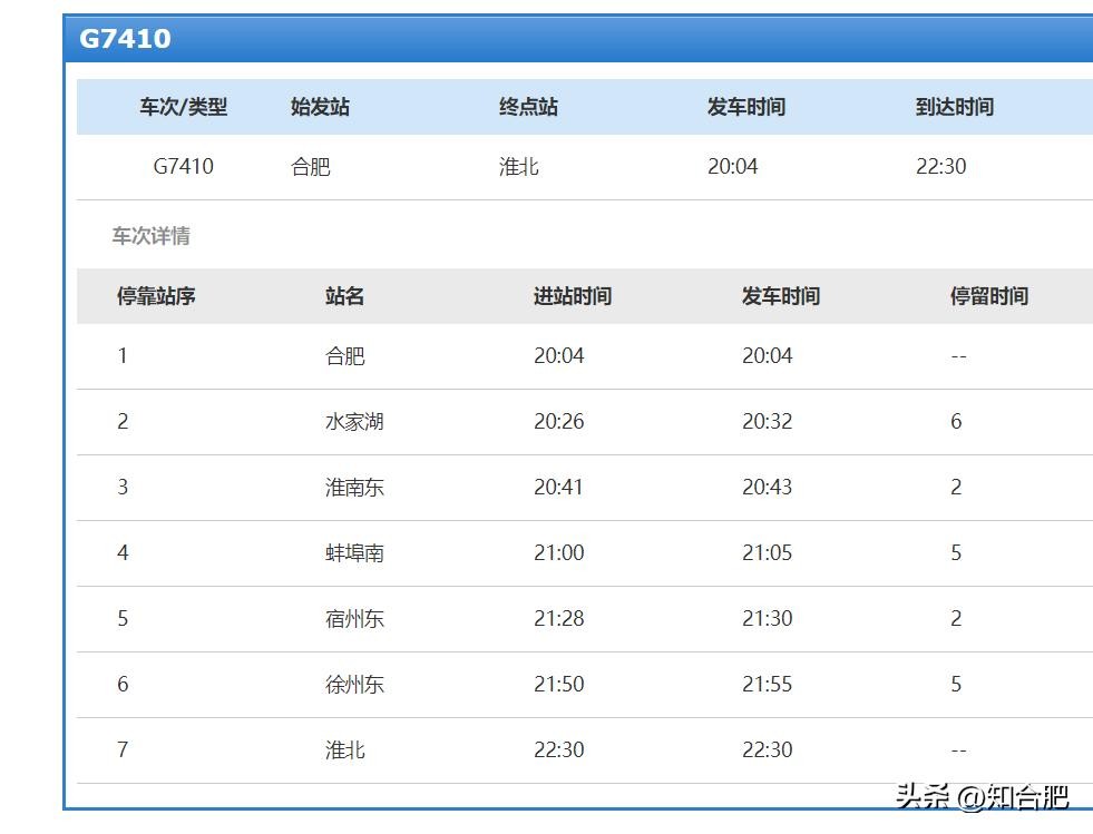 除了始发站合肥站,终点站淮北站外,G7410次列车,还经过水家湖站、淮南东站、蚌埠南站、宿州东站、徐州东站!