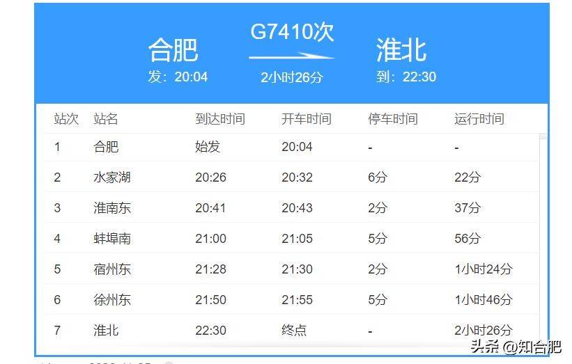 而且,发车时间也还不错,傍晚8点从合肥站上车,晚上10点半,就能到淮北。