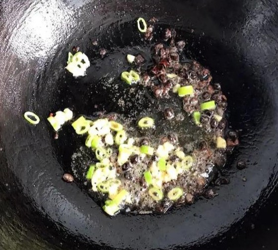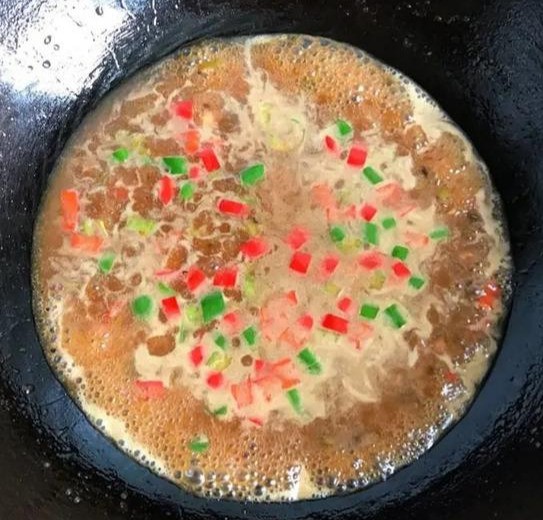 8. 至汤汁变少,加入青、红辣椒丁煮片刻。