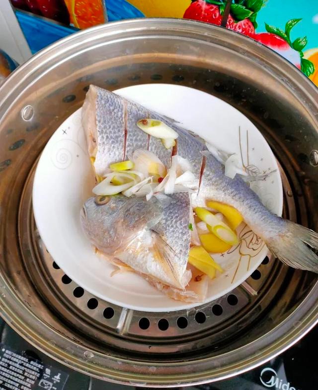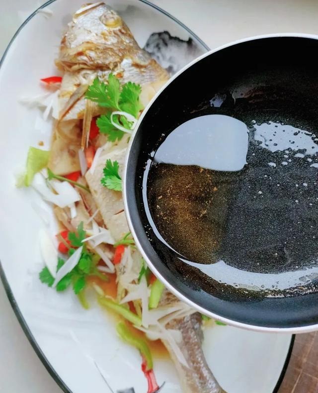 9. 鱼蒸好,去掉蒸鱼的汤汁,葱姜,倒入蒸鱼豉油。