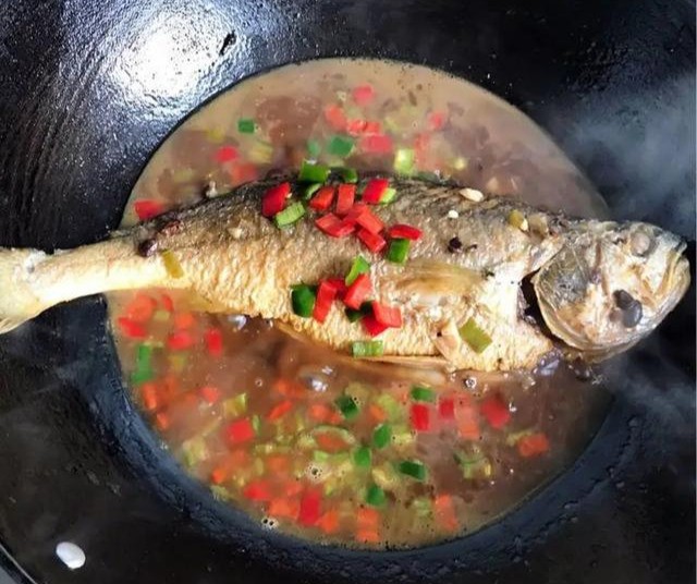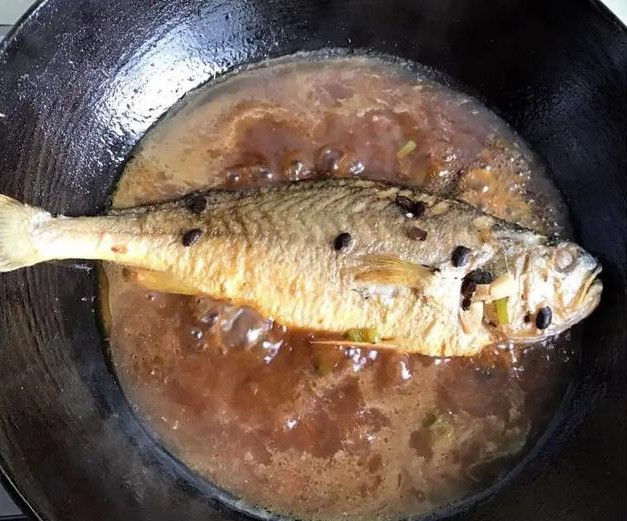 7. 放入煎好的黄花鱼煮开后转小火加盖焖煮7-8分钟左右。