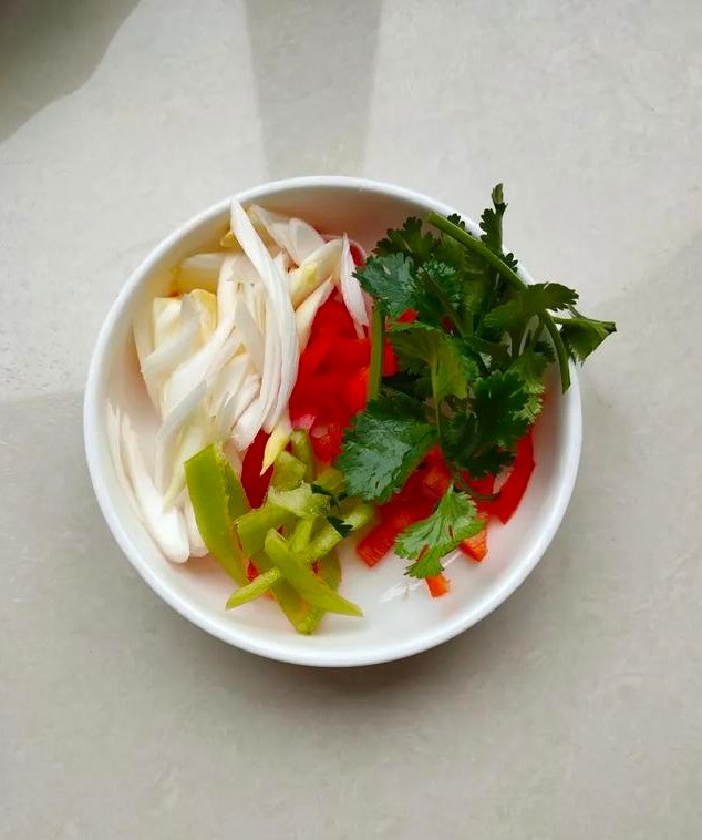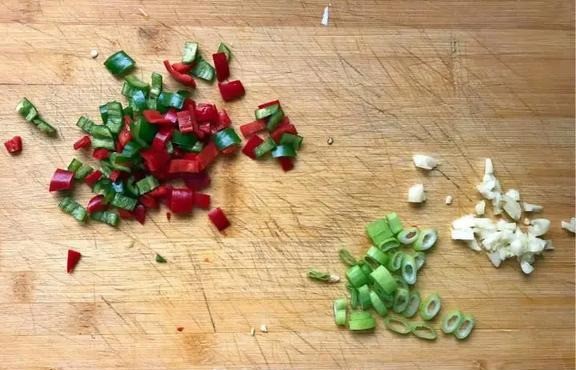 1. 葱、姜、蒜切碎,青、红辣椒切丁。黄花鱼杀洗干净。