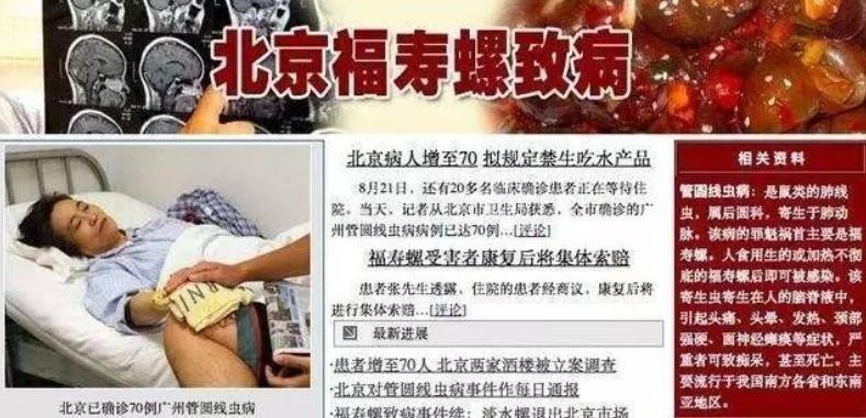 当时,由于食用凉拌福寿螺,导致一百多名患者感染广州管圆线虫病,这也导致福寿螺在多地被禁售了一段时间。