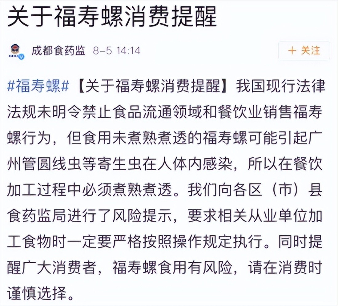 3、不用和发帖者一样谈到福寿螺就色变,但也正如相关部门提醒的一样,食用福寿螺还是存在一定的风险,所以消费时需要谨慎选择。