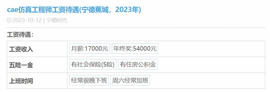 2、cae仿真工程师,工资17000元,年底奖金发了54000元,五险一金都有,经常很晚下班,周六要加班。