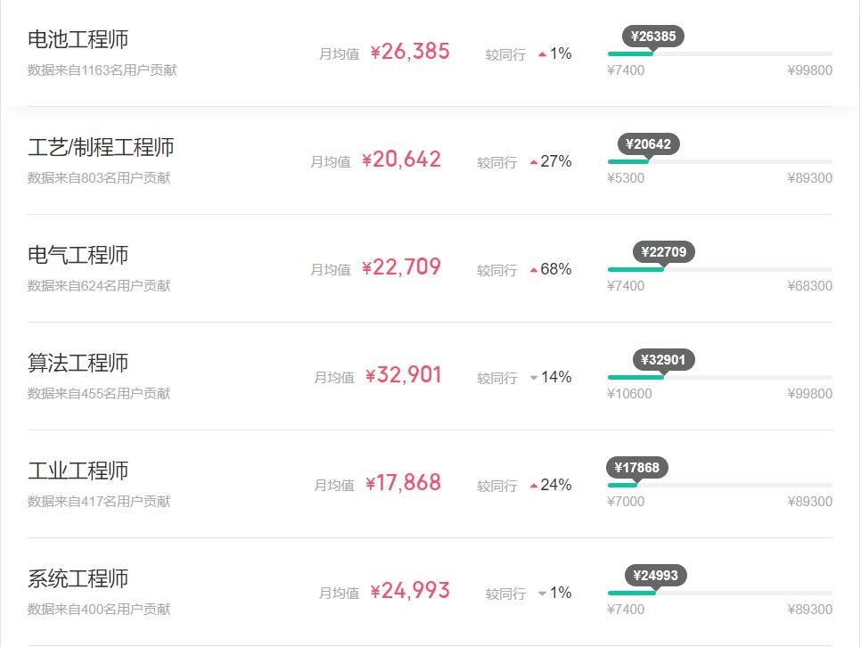 4、高薪职位众多,电池工程师月薪平均26385元、算法工程师平均32901元,系统工程师24993元,都是高薪的代表。