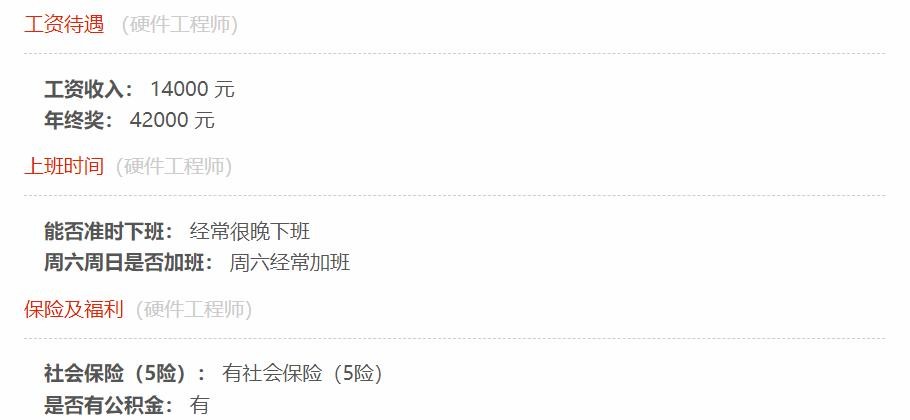 3、硬件工程师,月收入14000元,年终奖42000元,赶项目加班是常态,周六也是要上班,五险一金交齐。