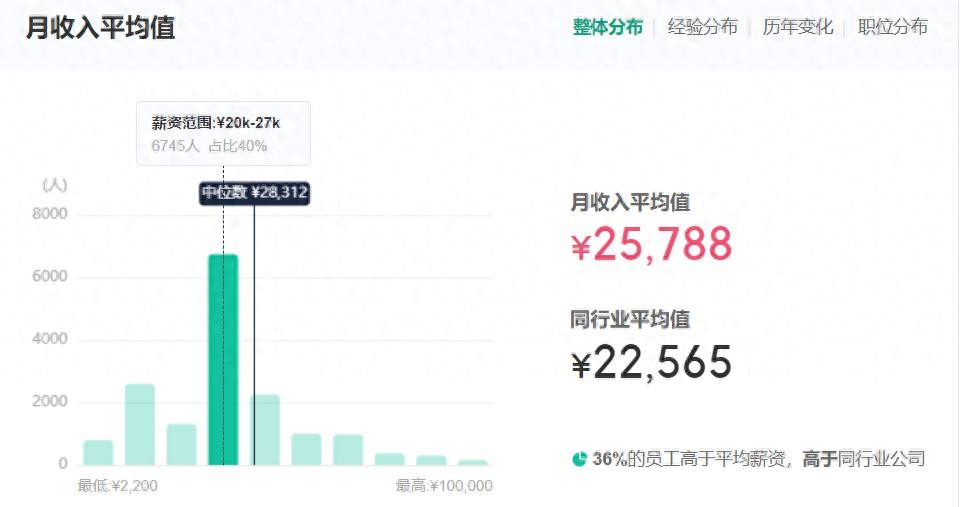 根据调查数据统计,宁德时代员工月收入平均值25788元,工资中位数为28312元,薪资范围在20K~27K的人数占比40%,36%的员工高于平均工资,整体收入高于同行业,属于行业顶尖水平。