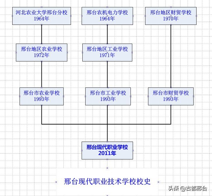 2011年6月22日根据市委、市政府安排,邢台工业学校、邢台农业学校、邢台财贸学校合并为“邢台现代职业学校”。
