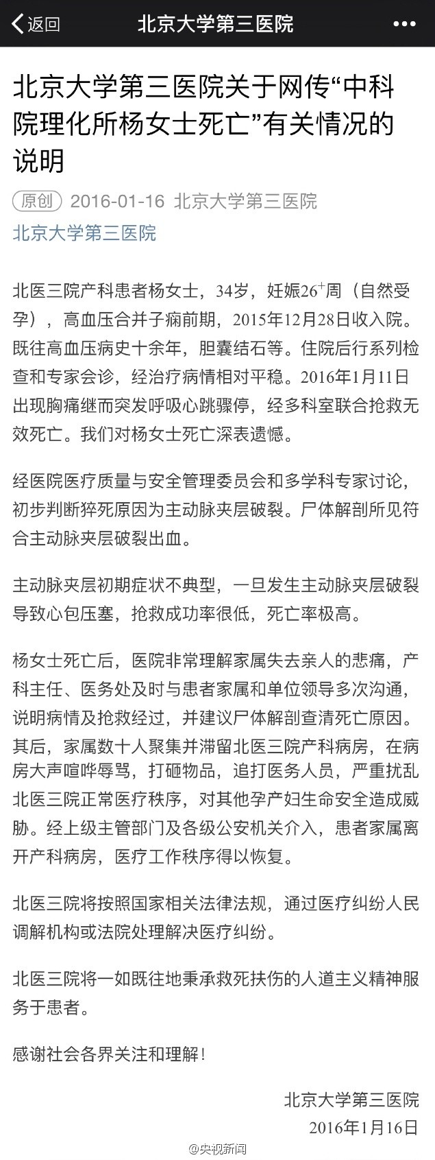 北医三院产妇死亡的事儿这两天在网上吵得炸开了锅。和其他医疗纠纷不同,这次出事的是中科院的科研骨干。所以死者家属除了占据病房、骚扰医务人员外,还发动中科院理化院发了封公函,要求医院调查死因,这还真是把医闹的水平提升到了新高度。
