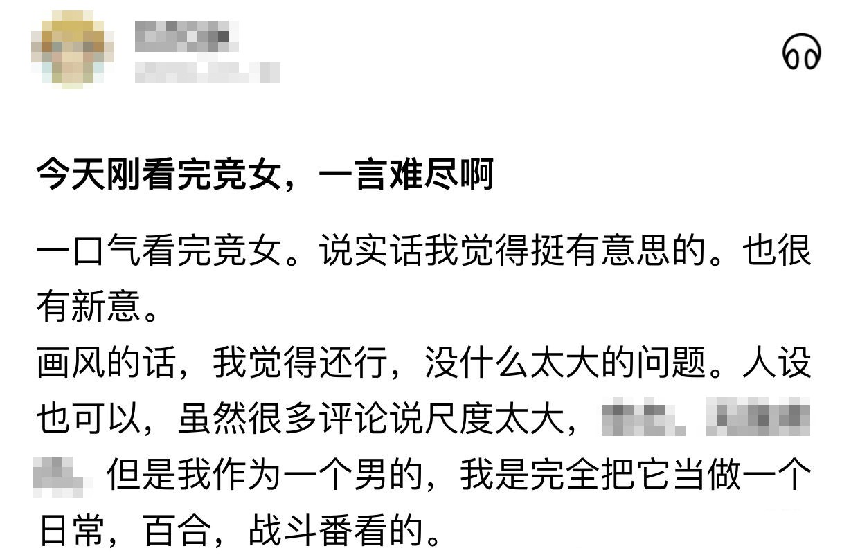 要知道,带着有色眼镜去观影的那些人,他们的关注点在人物身上而不在剧情身上,快进式的观影方式只适合看里番,不适合看《竞女》。