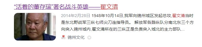 2、“活着的董存瑞”著名战斗英雄——翟文清:锦州文化 2014年02月28日 08:01