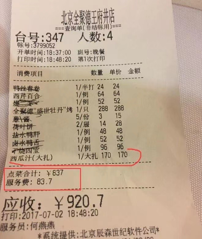 当年,有一位北京网友晒出了全聚德的“天价账单”,在经过了无数人的转评论之后,这家百年老字号成为了全网吐槽的目标。6个热菜一套烤鸭,加上主食甜点和饮品,账单金额就超过千元。更夸张的是,一壶西瓜汁竟然卖出了168元的高价,此外还要加收10%的服务费。